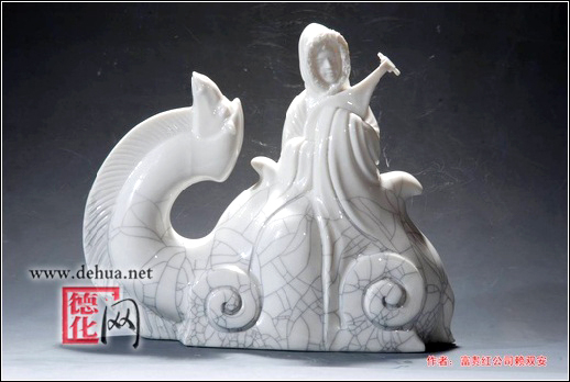 這僅僅只是一個(gè)平凡而美麗的古代女子。德化白瓷晶瑩剔透的材質(zhì),清麗、明朗,于人物是快樂和愉悅,是玉壁般的青春生命。造形形體間流動(dòng)旋轉(zhuǎn)的線,柔順和緩的面,舒展著人物形象含蓄、典雅的東方女性之美。人物座下的駱駝也被裝飾化了,情感化了,成了造形的有機(jī)部分,如同形成人物姿態(tài)的懷抱琵琶。裂紋釉的虛虛實(shí)實(shí)、忽走忽滯,這是創(chuàng)作者有意在表現(xiàn)工藝美感和淡化主題意圖,言外意境氣氛的營造本是東方藝術(shù)的喜好。