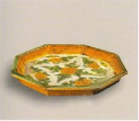 器呈八角形,折沿,淺腹,斜直壁,平底。淡紅色陶胎,胎質(zhì)堅硬細膩,內(nèi)外壁施黃釉,折沿處施綠彩,內(nèi)底施白、綠、黃三彩釉。
