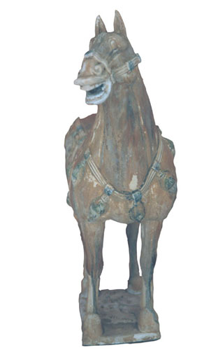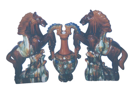 這是一件現(xiàn)代工藝品。瓶的造型和色彩,馬的形態(tài)與鞍韉佩頭都參考了唐代同類作品的造型、釉質(zhì)、釉色的特點而創(chuàng)作出來的,馬的鬃鬣、披散的馬尾、承托馬軀體的雕塑則完全是新的藝術(shù)構(gòu)思,頗具新意。與唐三彩相去很遠(yuǎn),它是現(xiàn)代工藝品,但它有黃土地帶粗獷雄放的民間藝術(shù)氣質(zhì)。所以它談不到真假之分辨。