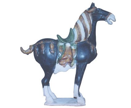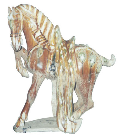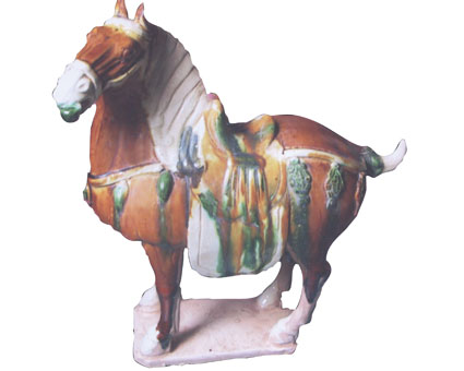 此馬的頭、身軀、四腿的長度等方面塑得符合三彩馬體形結(jié)構(gòu)、矯健有力。三彩釉相當(dāng)漂亮。但這件藝術(shù)品明顯的問題是: