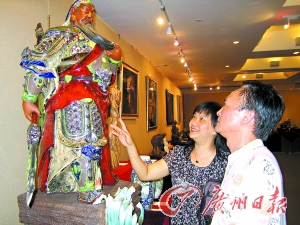 佛山陶瓷工藝大師楊銳華創(chuàng)作的藝術(shù)陶瓷作品《忠義天神》近日在廣東傳統(tǒng)工藝美術(shù)精品大展上獲得金獎(jiǎng)。該作品運(yùn)用中國(guó)傳統(tǒng)衣紋表現(xiàn)手法,結(jié)合西歐城雕表現(xiàn)方法,取用簡(jiǎn)練線(xiàn)條,高度概括衣紋、精雕細(xì)刻甲紋服飾,產(chǎn)生一種對(duì)比強(qiáng)烈的效果。再加上釉上配搭“藍(lán)綠均釉”與“華紅釉”對(duì)比度強(qiáng)而又統(tǒng)一協(xié)調(diào)有變化。圖為《忠義天神》在展出。(記者 黃建華 攝)