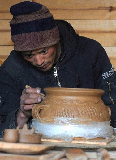 10月27日,尼西鄉(xiāng)湯堆的一位手工藝人正在制作黑土陶器皿。 近年來,云南省迪慶藏族自治州香格里拉縣尼西鄉(xiāng)利用良好的自然條件及特有的傳統(tǒng)手工藝技術(shù),積極發(fā)展生態(tài)雞養(yǎng)殖與黑土陶燒制等特色產(chǎn)業(yè),使“尼西雞”和“尼西黑土陶”成為云南省的知名特色產(chǎn)品,讓已參與其中的500多戶農(nóng)戶每戶每年增收超過萬元,有效推動了當(dāng)?shù)匾恍┎刈迦罕姷拿撠氈赂弧?/p>