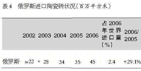 中國在2006年出口到俄羅斯的陶瓷磚達(dá)12百萬平方米,排在第二位,排名比西班牙和意大利靠前,僅次于白俄羅斯,應(yīng)該說中國出口量還有一定的潛力,隨著西班牙和意大利產(chǎn)品價格不斷上升,對中國是一個利好的局面,中國應(yīng)加大對俄羅斯的陶瓷磚出口!中俄政治與經(jīng)濟(jì)、外交關(guān)系目前良好,兩個大國家互惠合作的局面已基本形成,相信中國對俄羅斯陶瓷磚的出口前景是樂觀的!