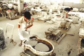 將調(diào)制好的石膏漿倒入樹脂模中,翻制注漿成型用的石膏模具。