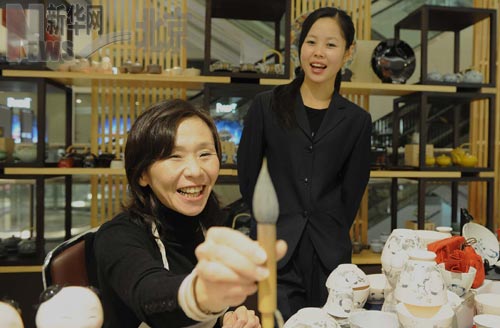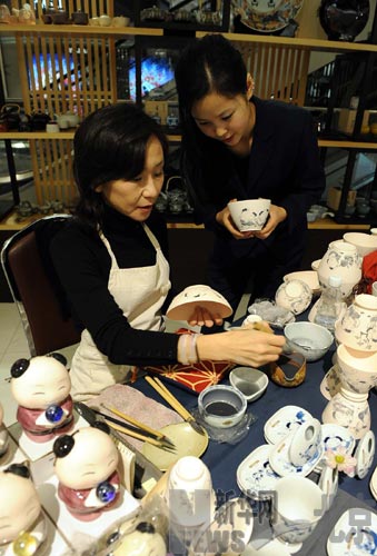 11月7日,日本西海陶器集團高級畫師近藤朱美(左、KONDO AKEMI)在北京新光天地商廈為中國賓客現(xiàn)場表演陶瓷繪畫技藝。11月6日至8日,日本陶瓷工藝和陶瓷文化展示表演活動在北京舉行,此次活動主辦方長崎西海陶器集團成立于1946年,是日本瓷都肥前地區(qū)的代表性公司,以精巧細致的“有田燒”“波佐見燒”等日本傳統(tǒng)瓷器著名。日本的陶瓷文化來源于中國,在融入日本文化風俗后,其陶瓷工藝別具一格,目前日本陶瓷產(chǎn)業(yè)擁有較強的科技開發(fā)能力和大批名牌產(chǎn)品。2007年,西海陶器集團進入中國市場,開始將日本優(yōu)秀陶瓷產(chǎn)品介紹給中國消費者。新華社記者 張旭 攝
