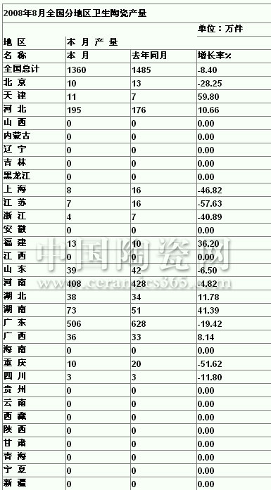 2008年8月全國分地區(qū)衛(wèi)生陶瓷產量
