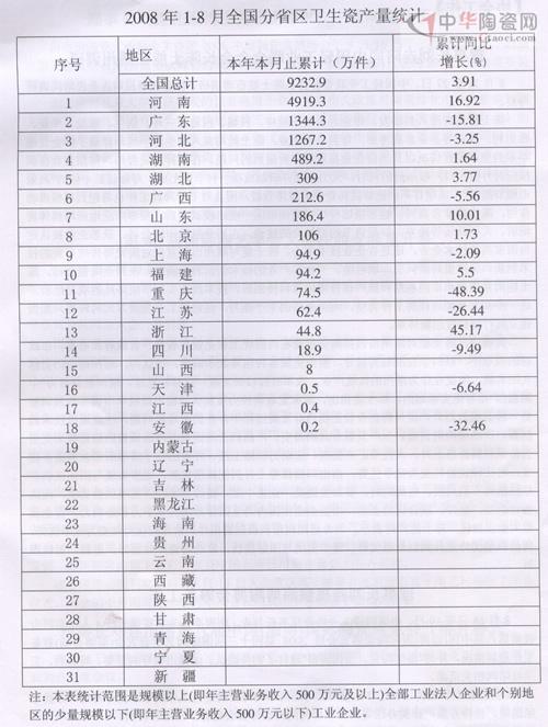 2008年1-8月全國(guó)分省區(qū)衛(wèi)生瓷產(chǎn)量統(tǒng)計(jì)