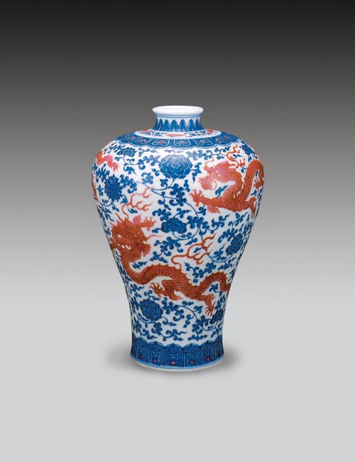 釉里紅的最大特點(diǎn)是燒制難度大,成品率極低。它是以銅為著色劑,在白胎上直接繪制各種圖案紋飾,在上面施一層釉,銅在高溫還原焰中發(fā)出了紅色,所以名叫“釉里紅”