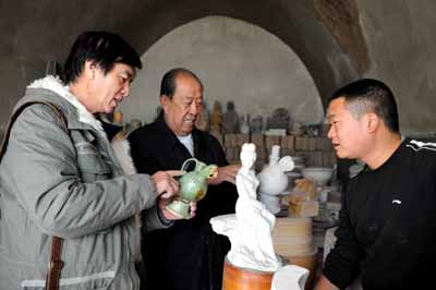 近年來,一些致力于草原游牧民族陶瓷藝術的收藏迷紛至沓來,在黃土丘陵山坳間的古窯附近訪古“探寶”、揀拾瓷片,為這片荒涼破敗的陶瓷老作坊帶來些許生機。圖為來自呼和浩特市的陶瓷藝術收藏家李大龍(左一)與藏友探討鮮卑族陶瓷制作藝術。
