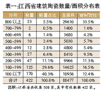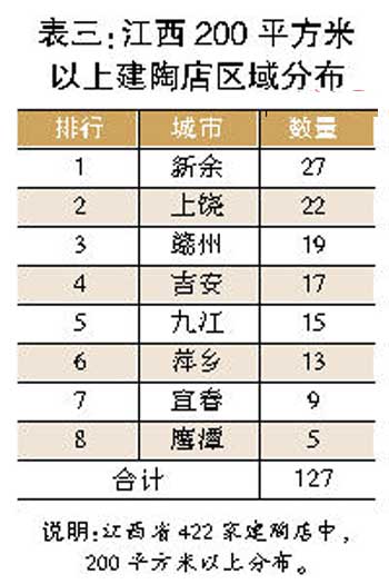從陶瓷店分布看(見表三),200平方米以上陶瓷店分布數(shù)量上,新余占優(yōu)勢,其次是上饒、贛州。據(jù)了解,新余的經(jīng)濟水平在江西省內(nèi)處于較高水平,陶瓷主要分布在粵新市場和東方巴黎家居城。今年受大環(huán)境影響,建陶市場的銷售也趨于平淡。