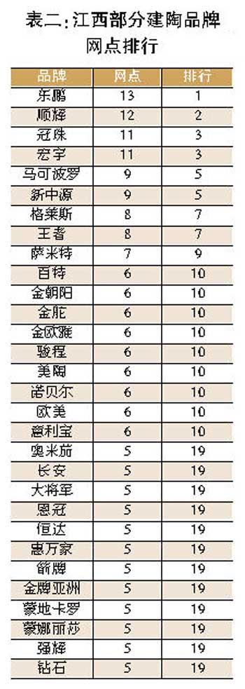 在網(wǎng)點排名前10名的品牌中(見表二),廣東品牌占數(shù)100%。東鵬仍居不可動搖的老大地位,順輝、冠珠緊跟其后,以強勢網(wǎng)點數(shù)量顯示自己的品牌實力。