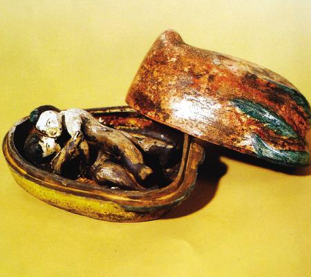 它是一個類似小瓷盒的東西,打開水果狀的蓋子,里面是一對男女呈交合狀的塑像。這種東西本來是置于箱底壓邪用的,當女兒快出嫁時,母親把“壓箱底”拿出來給女兒看一看,暗示她以夫妻之道。