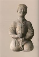 泥質(zhì)灰陶,頭、身分部模制,套合成型。頭戴平幘帽,內(nèi)穿小圓領(lǐng)中衣,外穿交襟長(zhǎng)袍,跪坐,上身直立,嘴對(duì)簫管,雙手前后握簫指孔,正鼓腮而吹,面帶笑容,使人觀其形若聞其聲的動(dòng)感情調(diào)。