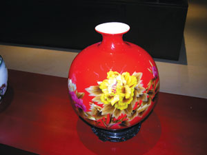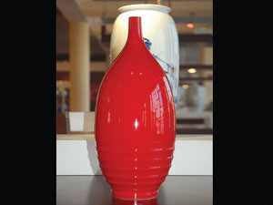 中國(guó)紅瓷的燒制采用了高科技手段,添加稀有元素并運(yùn)用化學(xué)合成方法,利用特別的專用窯爐設(shè)備控制溫度,經(jīng)過1200℃~1300℃的高溫?zé),才能保證紅瓷的顏色純正、鮮亮而不褪色。在前后五次高溫?zé)七^程中,任何一個(gè)環(huán)節(jié)有脆弱之處,都會(huì)導(dǎo)致前功盡棄,可見高溫?zé)拼蠹t瓷器的艱難。