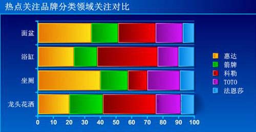 秀從品牌排行來(lái)看,惠達(dá)以23.12%的關(guān)注比例雄踞面盆市場(chǎng)的關(guān)注度冠軍之位,雖然惠達(dá)的品牌知名度和美譽(yù)度是所有面盆品牌中屈指可數(shù)的,但是惠達(dá)依然致力于品牌形象的提升和產(chǎn)品的宣傳推廣。春節(jié)期間率先在網(wǎng)絡(luò)媒體投放廣告,使得惠達(dá)衛(wèi)浴占據(jù)近近3成市場(chǎng)關(guān)注度份額,擂主地位固若金湯?评找16.32%的關(guān)注比例緊隨其后,技術(shù)戰(zhàn)是科勒開(kāi)拓衛(wèi)浴市場(chǎng)的必殺技。位于第三和第四的TOTO、箭牌關(guān)注比例接近,分別為11.86%和11.61%.樂(lè)家、尚高、安華等其它六大品牌的關(guān)注比例均不到9%.
