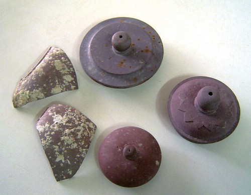 2004至2005年間,由瑞典海洋考古學(xué)者史坦(Sten Sjostrand)成立的南海海洋考古公司(Nanhai Marine Archaeology Sdn. Bhd.)與馬來西亞政府合作,在馬國西岸的Terenganu省Tanjong外六海里處,打撈了一艘明天啟年間(約1625年)的葡萄牙貨船,該船可能是由廣州駛往馬六甲的途中因故沉沒。史坦命名此船為“萬歷號(hào)(the Wanli)”。該船的出水物主要是明代萬歷時(shí)期的外銷瓷器,紫砂器極少,只撈起3只壺蓋與兩片破片(圖1),俱為圓器,其中一個(gè)壺蓋以珠鈕為中心,貼飾12棱的星形泥片,上面并押印一圈連續(xù)渦紋。這是目前已知水下考古中年代最早的出水紫砂壺。