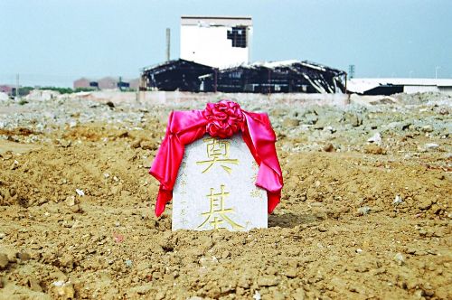 在原陶瓷廠址上樹立的購物商場奠基牌,遠(yuǎn)處的廠房還未完全拆完
