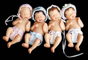 據(jù)英國媒體4月23日報道,加拿大女藝術(shù)家卡米爾·艾倫利以粘土為原料、用牙醫(yī)的器械做工具,雕刻出了一系列四肢五官俱全、神態(tài)逼真的“軟陶寶寶”。這些“軟陶寶寶”不僅形似,而且傳神,最小的才1英寸(約合2.5厘米),最大的也不過4英寸(約合10厘米)。“軟陶寶寶”的制作過程同硬瓷有些類似,要經(jīng)歷多道工序,在烤爐完成以后,再仔細(xì)增加各種細(xì)節(jié):將細(xì)細(xì)的馬海毛(安哥拉山羊毛)粘在嬰兒頭上,要用膠水一縷一縷地粘上去,最后涂上顏料,令其活靈活現(xiàn)。艾倫利的故事被廣泛報道。如今她最早制作的“軟陶寶寶”在網(wǎng)上可以賣到3000多英鎊。