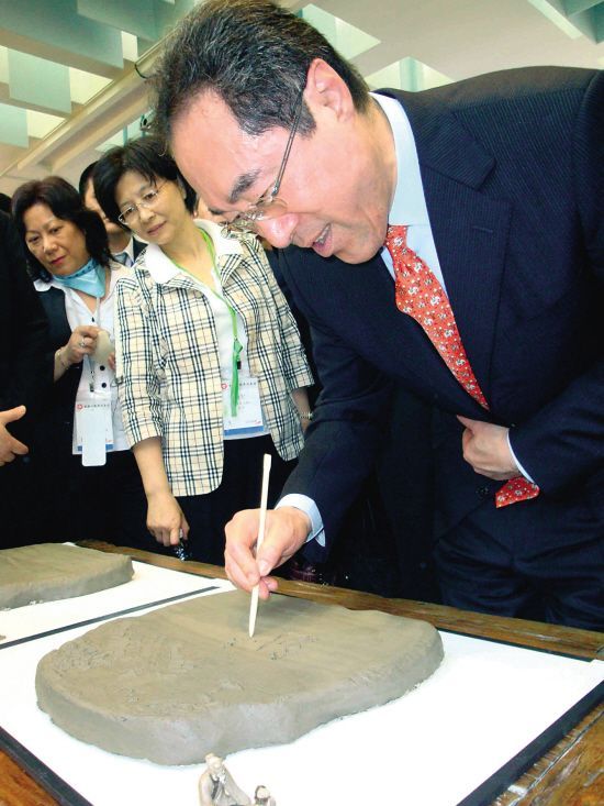 在創(chuàng)意產(chǎn)業(yè)園內(nèi)一幅主題為“珠三角之夢”的陶瓷制作的地圖旁,唐英年應(yīng)邀在陶坯上刻下“創(chuàng)意無限”四個(gè)大字。