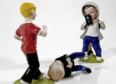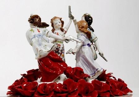 據(jù)英國《每日郵報》報道,英國一位設計新秀巴福德將廉價的陶瓷小雕像改造成畫廊爭相收藏的藝術品,用東方趣味陶瓷來展示西方社會現(xiàn)象,其中不乏黑色幽默的嘲諷。
