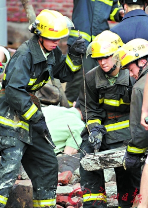 油泵房垮塌之后,大量碎石壓住了一名工人,但消防隊(duì)員憑借小型機(jī)械展開的救援行動(dòng)進(jìn)展緩慢。下午5時(shí)左右,現(xiàn)場(chǎng)指揮從附近工地調(diào)來一輛大型挖掘機(jī),先是將工廠墻壁推倒,擴(kuò)大作業(yè)面,隨后開始逐步挖開碎石堆。消防隊(duì)員則在一邊不斷地往廢墟上噴水,以降低地面溫度。一個(gè)小時(shí)后,在地下4米深處,救援人員發(fā)現(xiàn)了被埋工人,但已經(jīng)死亡,全身已經(jīng)燒成焦黑色。