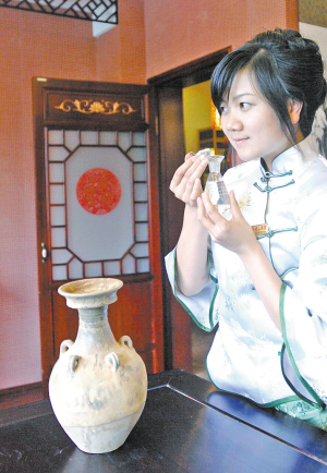 昨日上午,記者在名人茶館舉辦的古代陶瓷精品展現(xiàn)場看到,展品中,一件釉陶壺吸引著眾多參觀者的目光,在釉陶壺旁邊還放著一個玻璃容器。記者湊近了玻璃容器,聞到一股淡淡的酒香味。