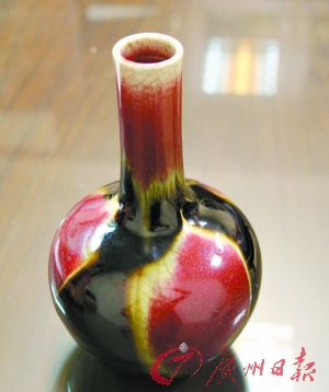 羅先生的祖上原是順德的名門望族,這個花瓶其實是家傳之物。“我判斷不了它的歷史,但它至少有70年。因為在我小時候,我就一直看著它。”花瓶高大約20厘米,瓶嘴較長,釉色主要為紅黑相間,羅先生還自帶了放大鏡,從放大鏡中可以清晰看到,黑色的釉彩泛有一點一點的金色光芒,舒翔首先對這個釉彩進行了鑒定,“鈞紅釉與烏金釉相映成趣,色彩雅致奪目。”