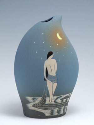 姜氏現(xiàn)代彩陶的特點在地其造型的處理,特別是尺度和比例關(guān)系方面,姜氏現(xiàn)代彩陶能夠突破以往的習(xí)慣比例關(guān)系,強調(diào)尺寸大小的對比變化,所以形成了比較突出的很強的形感,并能重新達到一種和諧美。這種大膽創(chuàng)新的設(shè)計,突破了對稱形的限制,因而出現(xiàn)了很多非圓形的異形器造型,而整體呈均衡狀態(tài),其中不乏新穎別致的造型樣式。再加上姜氏現(xiàn)代彩陶獨特的裝飾工藝手法,把原始彩陶質(zhì)樸的韻味和現(xiàn)代陶藝清新的格調(diào)結(jié)合在一起,使彩陶視角效果豐富多樣,色彩含蓄厚重,風(fēng)格素雅古樸,給人以全新的感覺。