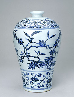 元代的梅瓶造型已經(jīng)發(fā)展得相當(dāng)成熟,特別是景德鎮(zhèn)生產(chǎn)青花梅瓶為明、清梅瓶的造型延續(xù)奠定了基礎(chǔ)。此時(shí)的梅瓶又是恢復(fù)到北方梅瓶的原有風(fēng)格,只是肩、腹、足等部位變粗,口部工藝細(xì)膩,這一時(shí)期的器物以江西省高安窖藏的青花梅瓶與河北省保定市窖藏出土的青花八方梅瓶為代表,同時(shí)還有現(xiàn)藏江西省揚(yáng)州博物館的藍(lán)釉白龍紋梅瓶。在造型的變異方面元末明初梅瓶出現(xiàn)特有的圓肩束脛式樣,其代表有現(xiàn)藏故宮博物院的元代龍泉窯刻花帶蓋梅瓶和現(xiàn)藏上海博物館的洪武青花“春壽”云龍紋梅瓶。