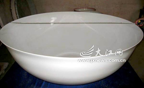 由景德鎮(zhèn)精心燒制完成的一只白薄胎大瓷碗和一塊大白瓷板近日面世。大瓷碗直徑1.23米、高1.58米、厚度為1.7毫米,形如一只大浴盆;白瓷板長3.68米、寬1.58米,也碩大無比。經(jīng)有關(guān)專家和景德鎮(zhèn)陶瓷協(xié)會(huì)鑒定,兩件作品系景德鎮(zhèn)陶瓷燒造有史以來同類品種中單體尺寸最大、拉坯制作工藝最難的作品,堪稱“碗王”、“板王”。據(jù)悉,兩件作品正在申報(bào)吉尼斯世界紀(jì)錄。