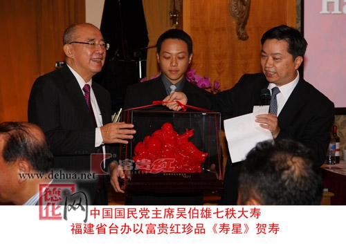 伯公在海峽兩岸和平發(fā)展上做出的杰出貢獻(xiàn),有目共睹。為此,福建省臺辦當(dāng)天也派專人攜貴禮前往祝壽,禮品《壽星》由中國瓷都·德化的富貴紅公司所制。