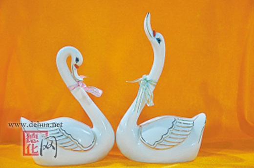 瓷雕“天鵝”,一雌一雄,引頸高歌,造型別致。高分別為19厘米和25厘米,寬為15厘米和16厘米;系高溫燒制,描金、具有實用和欣賞價值。