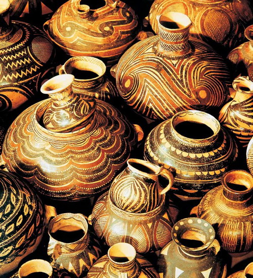 陶經(jīng)過了從灰陶、黑陶、白陶到印紋硬陶、彩陶的發(fā)展變化之路,在陶器的造型上也經(jīng)歷了由簡(jiǎn)單到復(fù)雜、由粗放到精細(xì)、由平淡到生動(dòng)的漸進(jìn)過程。早期陶最負(fù)盛名的作品之一是出土于陜西臨潼秦始皇陵陪葬坑的兵馬俑,也叫秦俑。秦俑位于陜西臨潼附近,是秦始皇陵的一部分。自1974年開始,迄今已發(fā)掘了呈品字排列的三個(gè)俑坑,出土了真人大小的兵馬俑6000余個(gè),其中有活馬大小的陶馬30余匹,戰(zhàn)車100余乘,組成了規(guī)模宏大的秦俑博物館。一號(hào)坑規(guī)模最大,長(zhǎng)230米,寬62米,深5米,面積達(dá)14260平方米,是主力步兵戰(zhàn)陣,排列著一個(gè)一個(gè)整齊威武的軍隊(duì)方陣,間有雄健高大的戰(zhàn)馬。陶俑有士兵、馭手、鎧甲軍士、軍官、將軍,姿勢(shì)有立姿、跪射姿。二號(hào)坑略小,是騎兵戰(zhàn)陣,有戰(zhàn)車上千輛。三號(hào)坑最小,僅有六七十個(gè)軍官和將軍俑,似為指揮部。這些兵馬俑做工極其精良,須發(fā)畢現(xiàn),面部表情生動(dòng),姿態(tài)自然,衣紋流暢,顯示出嚴(yán)肅剛強(qiáng)、器宇軒昂的神態(tài),戰(zhàn)馬也敦實(shí)有力、蓄勢(shì)待發(fā)。這形象地證明了當(dāng)時(shí)中國陶瓷技術(shù)達(dá)到了何等卓越的水平!這是一支為秦始皇死后護(hù)衛(wèi)的冥軍,為了建造它,老百姓付出了慘痛的代價(jià),但是也為我們留下了這舉世矚目的珍寶,被譽(yù)為“世界第八大奇跡”!現(xiàn)任法國總統(tǒng)、當(dāng)時(shí)的總理希拉克說:“不見金字塔,就不算到過埃及;不見兵馬俑,就不算到過中國!” 字串5