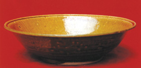 閩北私人收藏的一只五代醬黃釉唇口大碗 見圖 ,高5.8厘米,口徑20厘米,足徑10厘米,造型顯得寬矮、規(guī)整、輕巧,厚唇,口沿外翻,碗壁略顯斜直,胎壁較薄,寬矮圈足,見堅致的灰白色胎,碗內(nèi)壁底見圓形澀圈無釉,而澀圈內(nèi)中心有釉;圈足及足端無釉,而圈足內(nèi)又滿釉,并見弦刷釉痕。內(nèi)外壁均施滿醬黃色釉,開細小冰裂紋。碗外壁見施釉不勻之縮釉點,釉薄處可見壁上的輪制弦削痕以及近底足處的竹片刮削痕。