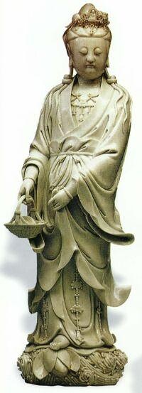 在故宮博物院收藏的德化窯瓷器中,有一件達(dá)摩立像聲望極高,屬明代晚期作品,出自明朝民間制瓷名家何朝宗之手。這尊瓷像高43厘米,光頭赤足,雙目圓睜下視,大耳鬢眉,鬢發(fā)均作卷曲狀,身披袈裟,雙手拱起于袖中,腳踩海水,如履云端,飄然若仙。人物脊背處刻有“何朝宗制”四字陰文印。通體施象牙白釉,滋潤(rùn)柔滑。整個(gè)造型精湛?jī)?yōu)美,身材魁梧,比例適度,制作精細(xì)。線條流暢,質(zhì)感極強(qiáng)。人物神態(tài)莊嚴(yán)肅穆,流露出一副超凡脫俗的形態(tài),個(gè)性鮮明而又不落俗套。作者在細(xì)部雕刻更是頗具匠心,把達(dá)摩外觀形韻、內(nèi)在氣質(zhì)與工藝技法有機(jī)地融于一體,達(dá)到了思想意蘊(yùn)與藝術(shù)效果的高度和諧統(tǒng)一,可謂精心之作。