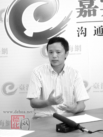 賴耀清:中共德化縣委統(tǒng)戰(zhàn)部副部長、德化縣工商聯(lián)主席。2007年4月8日,廈門德化經(jīng)濟(jì)文化促進(jìn)會(huì)成立,賴耀清當(dāng)選秘書長。圖為賴耀清接受臺(tái)海網(wǎng)專訪。