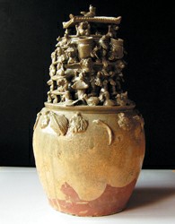 這種盛行于三國兩晉時期的堆塑瓷,外形似罐,通常稱之為“谷倉”。因與佛教及喪葬有關(guān),故又稱“佛寺罐”、“塔式罐”、“神亭”等。佛塔起源于印度,佛塔是佛家用來存放佛舍利與供奉佛像、佛經(jīng)之用。在中國最早的文化中是沒有類似于“塔”的建筑,與“塔”這個文字的。直至公元1世紀(jì)佛教傳入中國,被音譯為“浮屠”、“佛圖”的佛塔也隨著佛教文化在中國流行。塔的層數(shù)一般分為三、五、七、九、十一、十三層,佛教中等級最高的為七層塔,所謂七級浮屠。