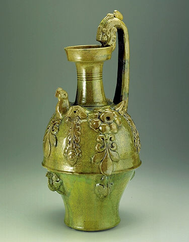 這件出於北 墓中的陶壺不僅罕見,而且裝飾精美。它以螭龍為柄,前端塑出雞首,壺上部貼塑對(duì)稱的蓮花、忍冬等花葉紋飾,壺下部貼塑四支展翅的鳳鳥。外觀華麗,典雅莊重。新穎的紋飾不僅顯示出當(dāng)時(shí)中國北方制陶業(yè)的先進(jìn)水平,還反映出中國與西域各國文化上的聯(lián)系與交流。