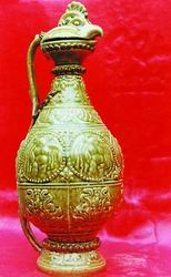 唐代是我國瓷器業(yè)繁榮發(fā)展的重要時(shí)期。當(dāng)越窯青瓷進(jìn)入唐代,形成了龐大的規(guī)模,建立了青瓷體系后,地域范圍也大幅度地?cái)U(kuò)大,故當(dāng)時(shí)有“南青北白”的說法,在中國瓷陶發(fā)展史上占有重要的地位,其中青瓷鳳頭龍柄壺,就是唐代的一種創(chuàng)新的特有產(chǎn)品。所謂鳳頭龍柄壺,因壺的上端為鳳頭形,柄為龍形,故名。溯其來源,它是吸收了波斯金屬鳳頭圖演繹而來的。燒制有白釉、青釉及三彩等,其造型新穎,設(shè)計(jì)巧妙、裝飾豐富,工藝也較復(fù)雜,為青瓷中之罕見之珍品。