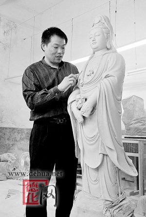 德化友濱陶瓷研究所所長、省級工藝美術(shù)師連紫華手持篾刀,正在雕制一尊仿明代瓷圣何朝宗的中國白觀音瓷雕,坯體高1.5米,燒成后高達1.28米。