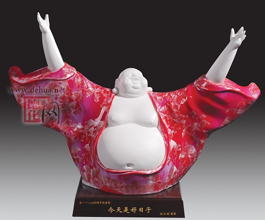 《今天是好日子》新中國甲子華誕慶典珍藏紀(jì)念瓷《盛世萬蓮》系列之一,窯變釉的彌勒,袒胸露腹、笑臉洋溢、舒展雙臂、嬌艷的偏紫色胭脂紅衣,扇花朵朵,燦若煙霞,活靈活現(xiàn),栩栩如生。
