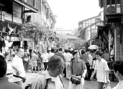 沿著石板路一步一觀望,視線全被路兩旁密密麻麻的特色小店和風味小吃擋住了,風格迥異的店面、花招迭出的招牌、一路吆喝叫賣,真是“舟車蟻聚萬商顯身手”。任何人走在這條石板路上都會駐足下來,任何一家商鋪都有可能激發(fā)購物的念頭,因為這里的工藝品店不僅包容了重慶的特色產(chǎn)品,還裝滿了來自貴州、西藏、云南的民間工藝品。從以畫人物寫真、素描、速寫鋼筆畫等為特色的“古鎮(zhèn)畫廊”到賣民間粗布衣、小掛件的“淑繡坊”,從經(jīng)營彩陶、字畫、古玩的“古綠軒”到以竹雕藝術(shù)品著稱的“小李子竹雕”……