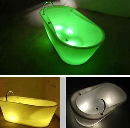這種聚乙烯材質(zhì)的照明浴缸安裝有一組鹵素?zé),或者你也有其他的一個(gè)選擇,一組可以編程的色彩斑斕的LED燈。同時(shí)浴缸的整體顏色也有白色、熒光色、檸檬黃、紅色和粉紅色多種選擇。