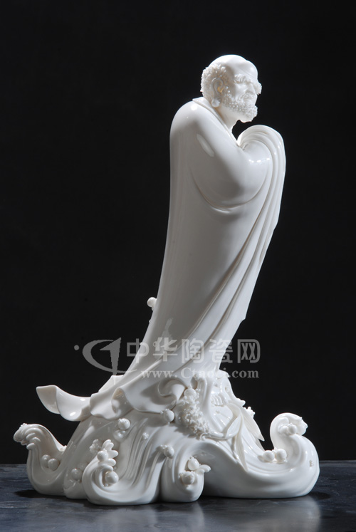 作品《一葦渡江》瓷質堅實厚重,瑩潤潔白,腳踏一葉蘆葦,昂首屹立于浪尖上,給人一種空靈、超脫的心境。兩只突鼓的眼睛炯炯有神,滿臉絡腮胡子,卷曲盤旋,身材魁梧,形象端莊,儀態(tài)非凡。