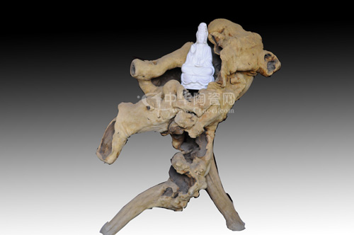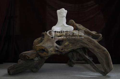 王大山介紹說:“首先是材料的選擇。在平時(shí)就要養(yǎng)成一種收藏的習(xí)慣,只要你覺得美的東西就要收藏好。‘這個(gè)世界不是缺少美,而是缺少發(fā)現(xiàn)美的眼睛。’其次是造型的搭配。視覺感受特別重要,圓與扁、長與短、復(fù)雜與簡單等要相輔相成,揚(yáng)長避短,符合常理。”比如下圖中根雕是橋型的,線條簡潔、流暢,這樣配上一尊小型的瓷雕,橫上配一點(diǎn),非常完美。人們可以充分發(fā)揮自己的藝術(shù)潛在力,可以想象在此根雕放一尊立像觀音,橫上一豎,既符合審美規(guī)律,又營造出無窮的意境,美不勝收!正所謂:“詩無達(dá)估。”同理,藝術(shù)也是無止境的,百搭瓷雕與根雕,尋求最佳境界!