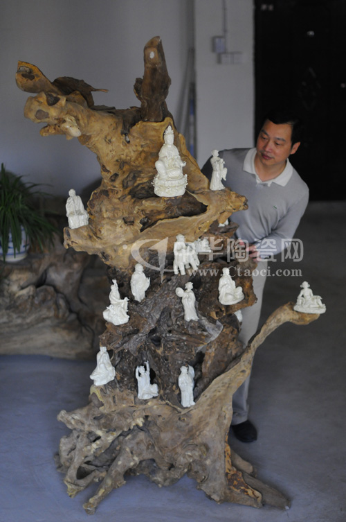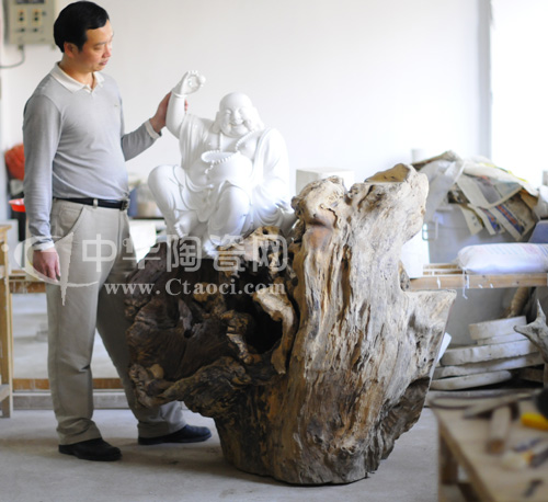 從事幾十年藝術(shù)的王大山,不斷探尋藝術(shù)的新領(lǐng)域。他說:“藝術(shù)是無界限的,美是統(tǒng)一的,東方文化、西洋文化、傳統(tǒng)文化、現(xiàn)代文化……他們之間是緊密聯(lián)系在一起的,可以互相彌補(bǔ)、互相融合。”他突發(fā)奇想,何不嘗試將根雕與瓷塑完美地藝術(shù)融合在一起。