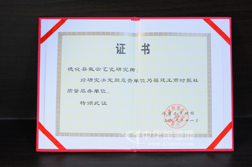 德化縣戴云藝瓷研究所在陳國欽的帶領(lǐng)下,本著“用心溝通、真誠服務(wù)、價格公開、誠信經(jīng)營”的原則,贏得客戶、商家等的贊譽(yù)與信賴。2009年11月,經(jīng)《福建工商時報》的研究決定,同意戴云藝瓷成為福建工商時報質(zhì)量服務(wù)單位。(小俠、小米)