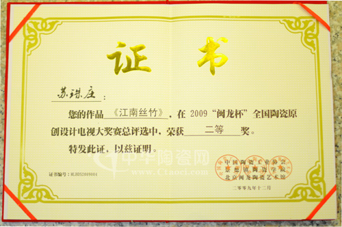 2009年11月24日,2009“閩龍杯”全國(guó)陶瓷原創(chuàng)設(shè)計(jì)大獎(jiǎng)賽在人民大會(huì)堂頒獎(jiǎng),德化蘊(yùn)玉瓷莊第四代傳人蘇珠莊所創(chuàng)作的《江南絲竹》在2570件中脫穎而出,榮獲二等獎(jiǎng)。