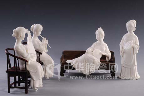 《江南絲竹》以德化特有的“中國(guó)白”為原料,潔白透亮、如脂似玉,淋漓盡致地表現(xiàn)出了江南女子的溫柔、秀美,極具欣賞價(jià)值。作品中四個(gè)江南女子或坐、或立、或躺,或持扇、或彈琵琶、或吹笛子,讓人感覺像小橋流水,亦像是一曲婉約的小曲,讓人產(chǎn)生很多的遐想:人在白墻灰瓦的大院里面,聽著音樂,悠閑自在,表現(xiàn)人生活狀態(tài)的一種場(chǎng)景。