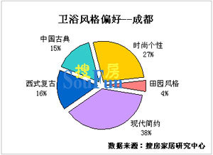 38%的消費(fèi)者將現(xiàn)代簡(jiǎn)約作為自己最喜愛(ài)的衛(wèi)浴裝修風(fēng)格,現(xiàn)代簡(jiǎn)約成為成都地區(qū)衛(wèi)浴風(fēng)格的關(guān)鍵詞;成都消費(fèi)者尤其是年輕群體希望衛(wèi)浴產(chǎn)品能夠更多的體現(xiàn)出個(gè)性化的特點(diǎn),時(shí)尚個(gè)性風(fēng)格占27%;此外,中國(guó)古典風(fēng)格和西式復(fù)古風(fēng)格在成都的受歡迎程度相當(dāng),占比分別為15%和16%;田園風(fēng)格較受中老年群體的偏愛(ài),4%的消費(fèi)者會(huì)選擇田園式的裝修風(fēng)格。